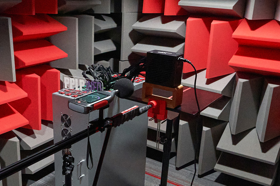 在环境噪音低于10分贝的消音实验室中,测试电源全负载范围内的噪音并进行星级评估,三类负载模式下按静音表现分为五个星级。^In a anechoic chamber with environmental noise levels below 10 decibels, the noise within the full load range of PSU is tested and evaluated for star level. Under three types of load modes, the noise reduction performance is divided into five levels.